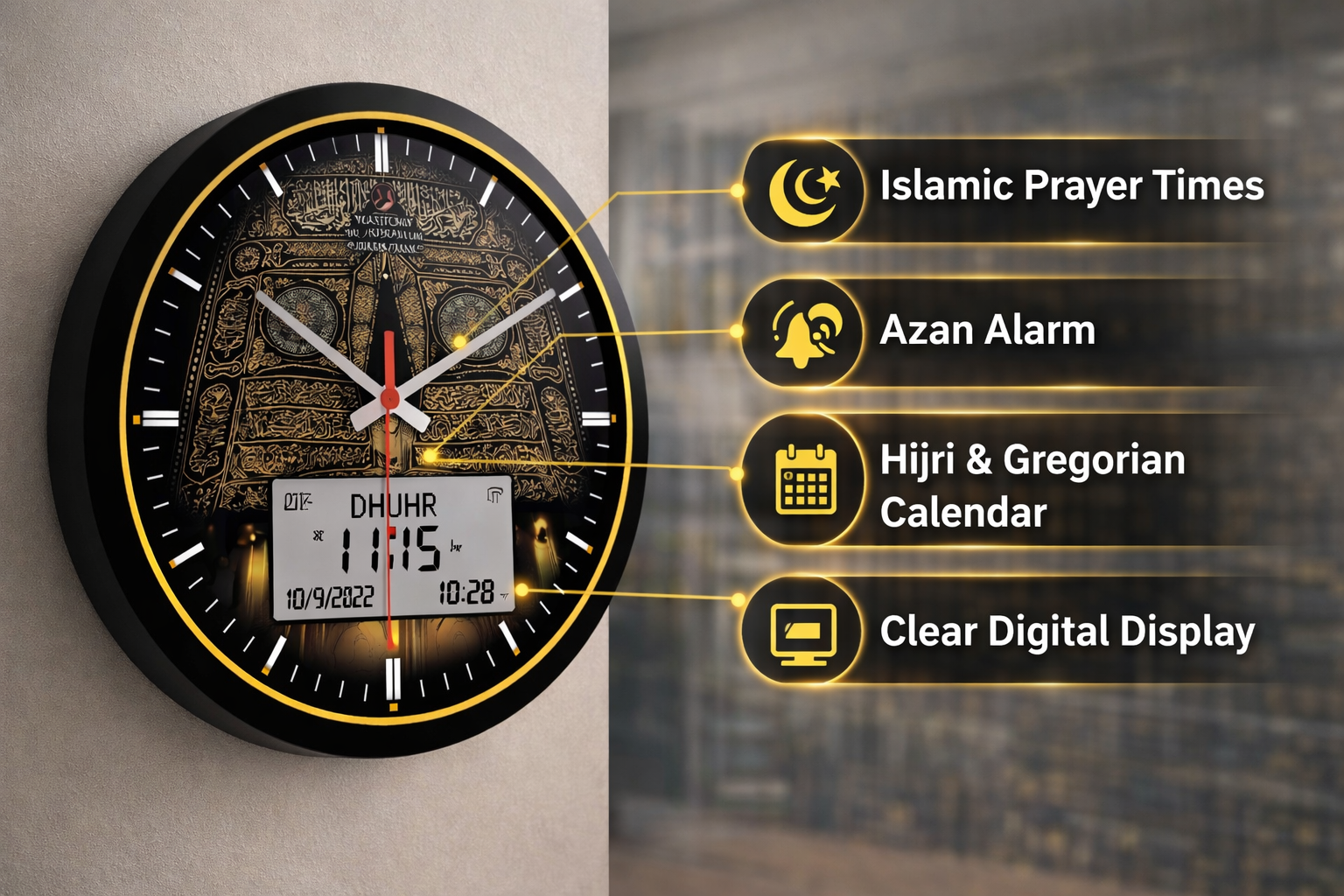 تتميز الساعة بشاشة رقمية مدمجة تعرض مواقيت الصلاة اليومية (الفجر، الظهر، العصر، المغرب، العشاء) مع إمكانية ضبط المدينة للحصول على التوقيت الصحيح تلقائيًا. كما تدعم خاصية الأذان بصوت واضح عند دخول وقت الصلاة
