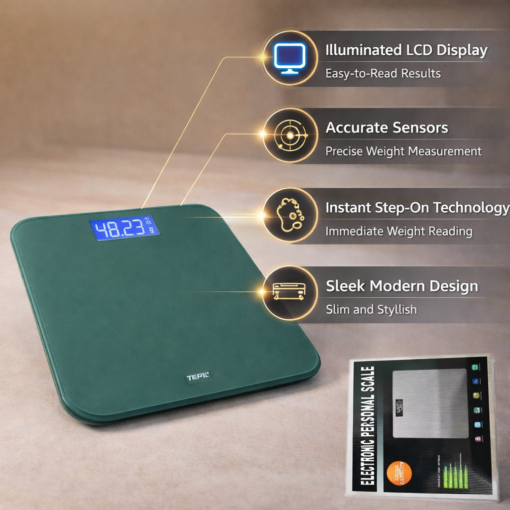 ميزان إلكتروني أنيق وعصري مصمم بدقة عالية لقياس الوزن بسهولة وموثوقية. يتميز بسطح من الزجاج المقوى المتين مع أربعة مستشعرات دقيقة من الفولاذ المقاوم للصدأ لضمان قياس دقيق وسريع. يعمل بتقنية Step-On التي تتيح القياس الفوري بمجرد الوقوف على الميزان، كما يحتوي على شاشة رقمية واضحة لعرض الوزن بسهولة. تصميمه النحيف يجعله مثالياً للاستخدام في المنزل أو الحمام مع مظهر عصري يناسب أي ديكور